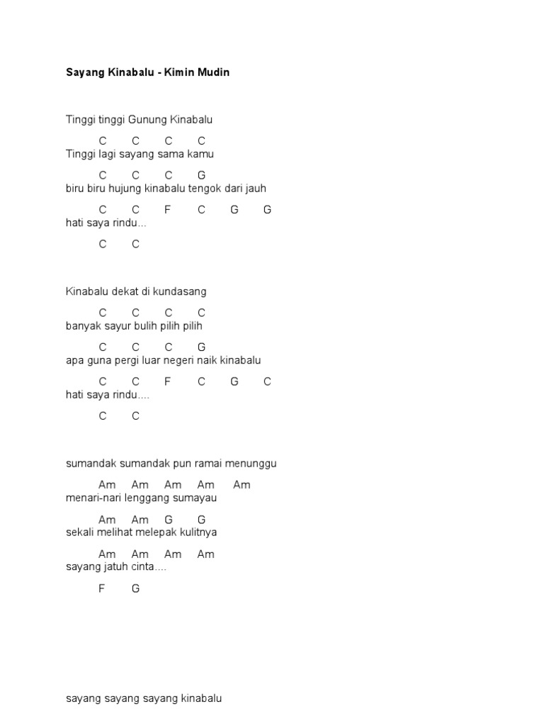 Comment must not exceed 1000 characters. Am f apa guna pergi luar negeri. Gunung kinabalu mempunyai puncak diketinggian 4.095 meter dari permukaan laut. Here you can post a video of you playing the sayang kinabalu chords, so your fellow guitarists will be able to see you and rate you. No chords automatically detected in tinggi gunung.mid for the fingered bass instrument.